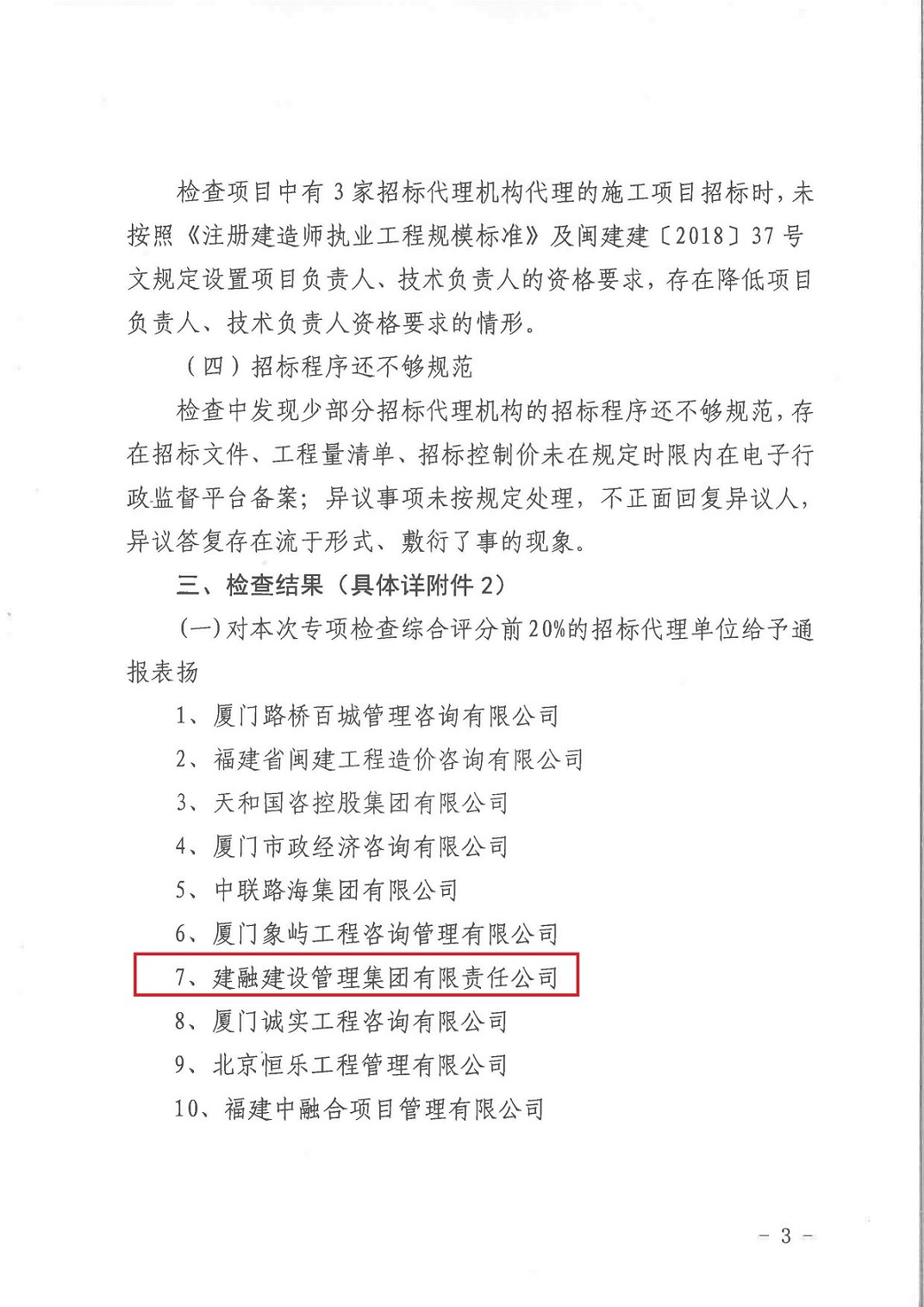 建融集团被厦门市建设局通报表扬
